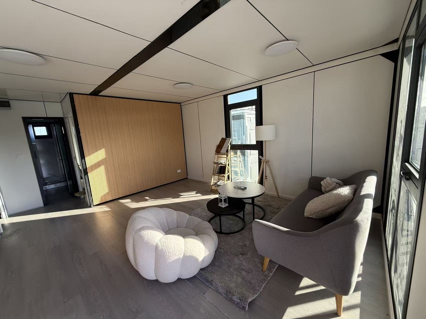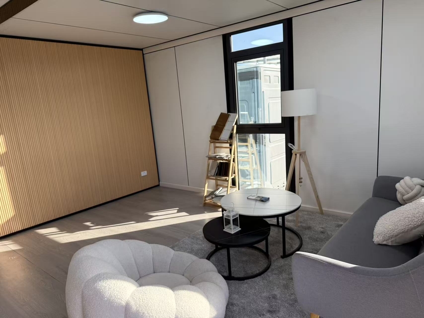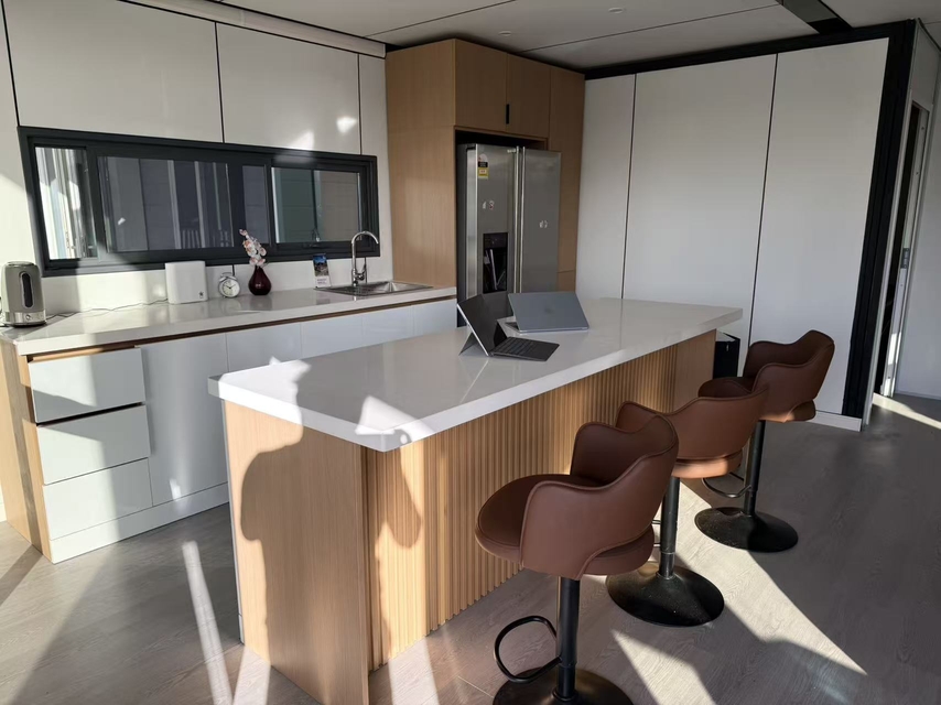 The 30FT expandable home is designed for comfort and functionality, featuring two spacious bedrooms, a versatile living area, and a well-equipped kitchenette that can be connected to a gas stove and fridge. The kitchen offers ample storage with a full set of cabinets, drawers, and overhead cabinets, providing everything needed for a modern cooking experience. The bathroom is a highlight, boasting a full-width large shower area with Premium shower heads, a toilet, and a vanity with a full mirror cabinet, ensuring a luxurious and practical space.