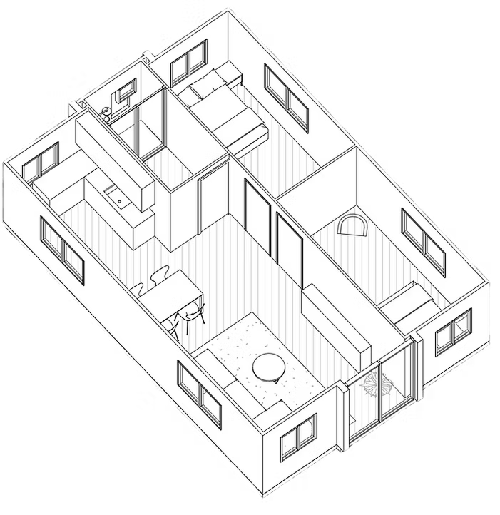 The 30FT expandable home is designed for comfort and functionality, featuring two spacious bedrooms, a versatile living area, and a well-equipped kitchenette that can be connected to a gas stove and fridge. The kitchen offers ample storage with a full set of cabinets, drawers, and overhead cabinets, providing everything needed for a modern cooking experience. The bathroom is a highlight, boasting a full-width large shower area with Premium shower heads, a toilet, and a vanity with a full mirror cabinet, ensuring a luxurious and practical space.